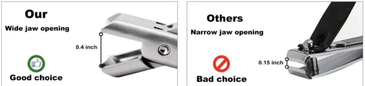 Unlike regular nail clipper with a narrow jaw opening, Cumuul has sharp edge with 0.4” wide opening that can easily cut thick toenails.