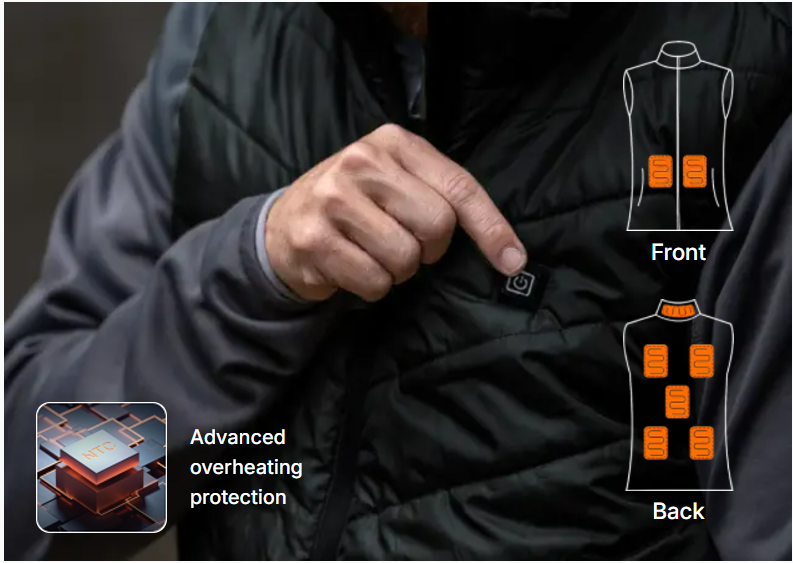 Our vest is machine washable with water-safe carbon fibre wires, and the insulated waterproof power interface ensures safety for easy cleaning every time. Just unplug and let the washing machine handlethe rest