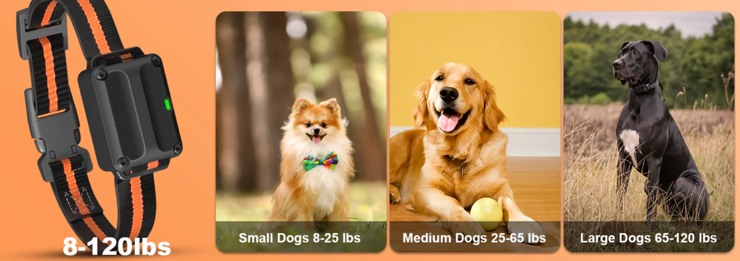 Suitable for dogs of all sizes, with a neck size range of 7-24.4 inches and a weight range of 8-120 pounds. The soft nylon collar strap ensures comfort and durability.