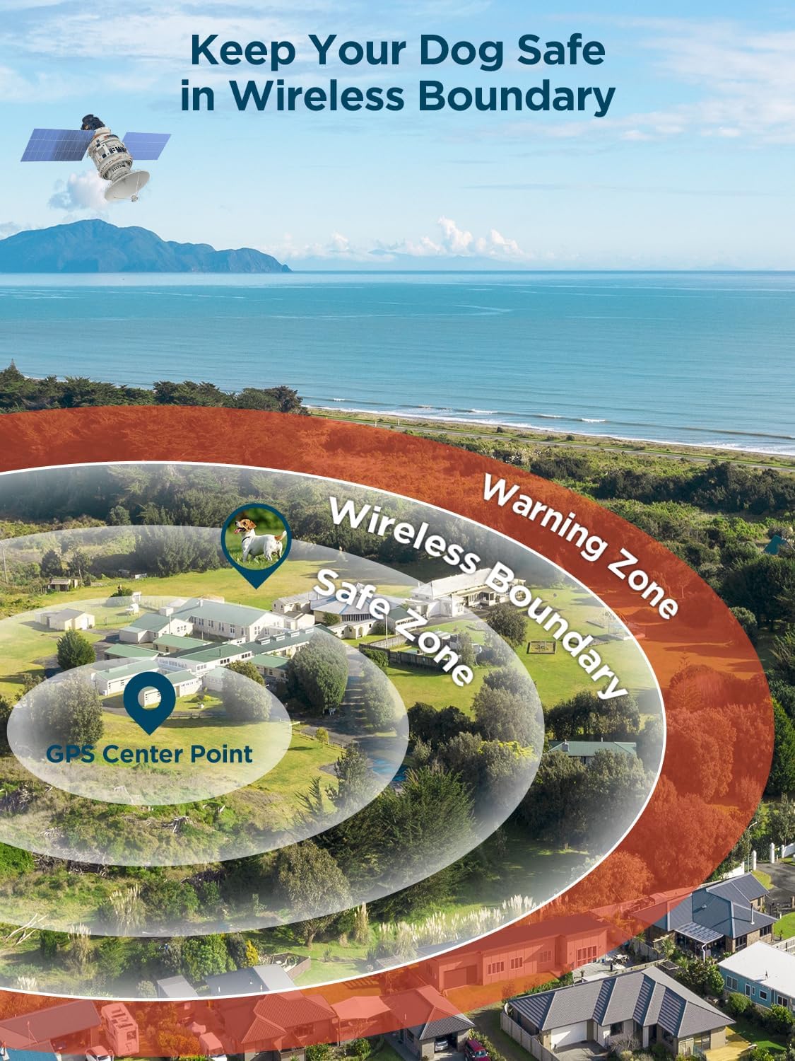Our GPS wireless fence collar uses satellite positioning technology to locate the device and create a circular boundary. The center point of the boundary is the location of the device when it first receives the GPS signal.